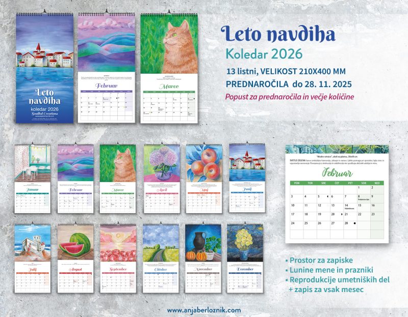 Tako so nastali tudi motivi koledarja 2026 – iz trenutkov, ko sem opazila svet okoli sebe in ga prelila na slikarsko platno. Ujela sem podobe, barve in občutke, ki so me navdihnili v vsakdanjem življenju.